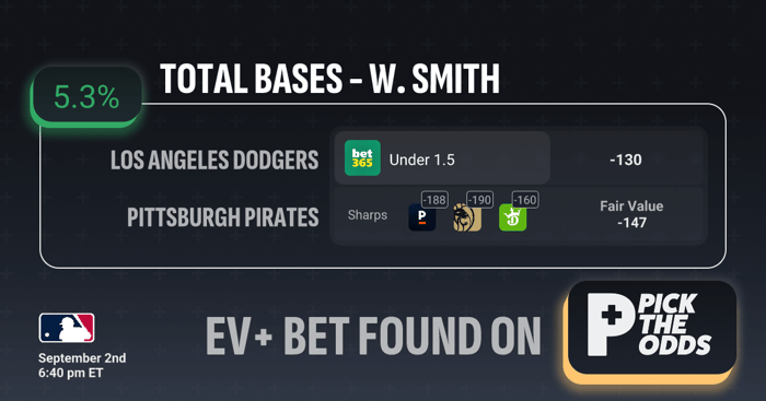 EV Betting is all about identifying bets that have a long-term mathematical edge over the sportsbook. In this case we're getting Smith Under 1.5 Total Bases at -130 when other sportsbooks have it priced much higher.