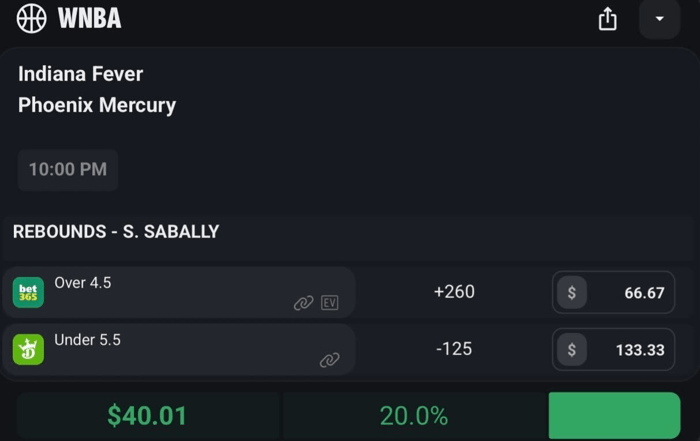 This is an arbitrage bet meaning you bet on both outcomes and no matter what happens in the game you win money. This arbitrage is also a middle meaning if Sabally lands on exactly 5 rebounds you win both.