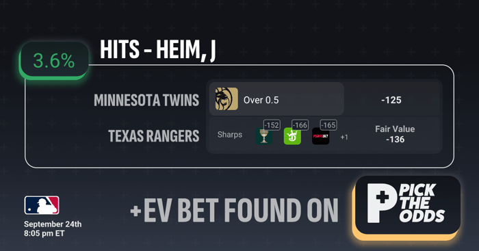 Other books are posting this line higher than the -125 line which indicates they believe Heim has a higher probability of going over the line of 0.5 hits. MGM is on an island with their -125 line.