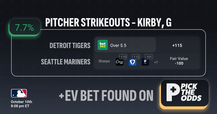 Along with the recent performances this is also a strong +EV bet because Bet365 is offering George Kirby’s strikeout line at Over 5.5 (+115), while sharp books like Circa, FanDuel, and Pinnacle have the same line priced around -110 to -101, implying a fair value near -100. That pricing discrepancy creates a 7.7% edge, meaning the true probability of Kirby hitting 6+ strikeouts is higher than the odds suggest. Facing a Tigers lineup that ranks near the bottom in strikeout avoidance and struggles against right-handed pitching, Kirby’s efficiency and command give him solid potential to go deep into the game. When sportsbooks with sharper models set lower odds, it signals that Bet365’s line is mispriced — making this a value spot for bettors looking to capitalize on inefficiency.