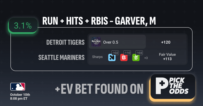 This play on Mitch Garver Over 0.5 Runs + Hits + RBIs at +120 on Hard Rock presents clear value because sharper books like DraftKings, BetOnline, and DraftKings have the same prop priced between -102 and -110, translating to a fair value of +113. That 3.1% edge suggests the true probability of Garver recording at least one key offensive stat is higher than the posted odds indicate. Garver has been swinging well lately and typically bats in a favorable spot in the Mariners’ order, giving him multiple opportunities to contribute across categories. When sharper markets show tighter, lower-priced lines, it’s a sign the Hard Rock number is slightly off — creating a small but meaningful positive expected value opportunity.