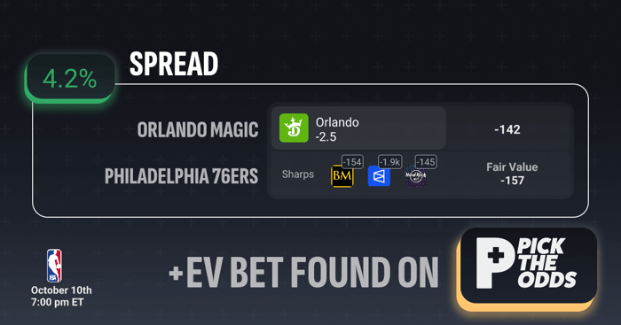 This wager on the Orlando Magic -2.5 at -142 holds positive expected value because sharper books like BetMGM, Pinnacle, and Hard Rock are pricing the same line between -145 and -154, giving a fair value around -157. That discrepancy signals that the market consensus expects Orlando to cover more often than the listed odds imply. With the Magic trending upward and likely facing a shorthanded or inconsistent 76ers squad, the edge leans toward Orlando maintaining control. When multiple sharp books are shaded further toward one side, it indicates the current price hasn’t fully adjusted — creating a 4.2% value edge for bettors taking the Magic at this number.