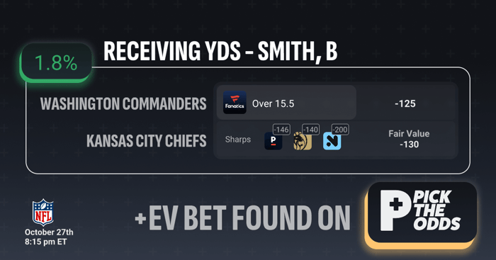 This is a +EV bet because the current Fanatics line of -125 offers value against a fair price of -130, creating roughly a 1.8% edge. When sharper books are pricing the same prop closer to -140 or higher, it signals the market consensus expects the over to hit more often than the posted odds imply. Essentially, you’re getting a discounted price on the same probability outcome, which is the foundation of +EV betting. Over time, consistently taking these mispriced lines compared to sharper markets generates long-term profitability, even on small percentage edges like this one.