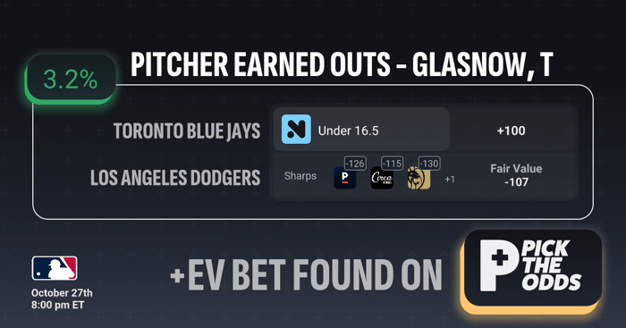 This is a +EV bet because the Under 16.5 Outs line is priced at +100, while the fair market value sits around -107, creating a 3.2% edge. Multiple sharp books — including Pinnacle, Circa, and MGM — have this same prop juiced toward the under, implying a higher true probability than the even-money price suggests. Essentially, you’re getting plus money on a side that sharper markets view as the more likely outcome. These types of discrepancies typically arise when slower-moving books lag behind sharper line movement, giving bettors an opportunity to capture positive expected value before the market corrects.