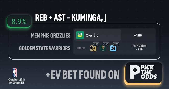This is a +EV bet because the market price on Jonathan Kuminga’s Over 8.5 Rebounds + Assists is +100 on Bet365, while sharp books have it heavily juiced to the over (ranging from -130 to -170) with a calculated fair value of -119 — creating roughly 8.9% expected value. That means you’re getting a strong price advantage versus sharper lines, implying the true probability of hitting is closer to 54–55% rather than 50%. Kuminga’s expanded role and strong early-season stat lines (clearing this number in 2 of 3 games) support the over, but the key betting edge comes from the mispriced odds — you’re effectively betting on a line that should be shorter, making this a long-term profitable play.