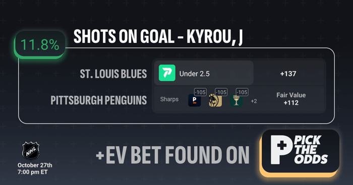 This is a +EV bet because Jordan Kyrou’s Under 2.5 Shots on Goal is priced at +137, while sharp books have it closer to -105 with a fair value around +112 — giving an 11.8% expected value edge. That means the market consensus suggests the true probability of this bet hitting is significantly higher than the implied odds you’re paying. Kyrou has gone under this number in 3 of his games this season and is averaging under 2 shots per game, indicating the line may be inflated based on his reputation rather than current form. Getting plus money on a prop that’s being priced shorter by sharper books creates a clear long-term profitable angle.