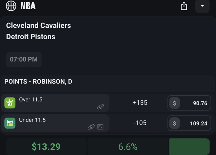 Let's say you take Duncan Robinson Under 11.5 Points Made on Bet365 at -105 odds for $109.24 If this side hits you win $213.