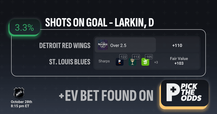 This is a +EV (positive expected value) bet because the Over 2.5 Shots on Goal for Dylan Larkin is priced at +110, while sharp books like Pinnacle and DraftKings have it closer to -105 to -113, implying a fair value of +103. That means you’re getting about 3.3% edge over the market consensus — a key signal that the price is misaligned in your favor. With Larkin averaging 3.6 shots per game this season and facing a Blues defense allowing 4.33 goals per game (31st in the NHL), the data supports the over, and the odds provide clear value compared to sharper markets