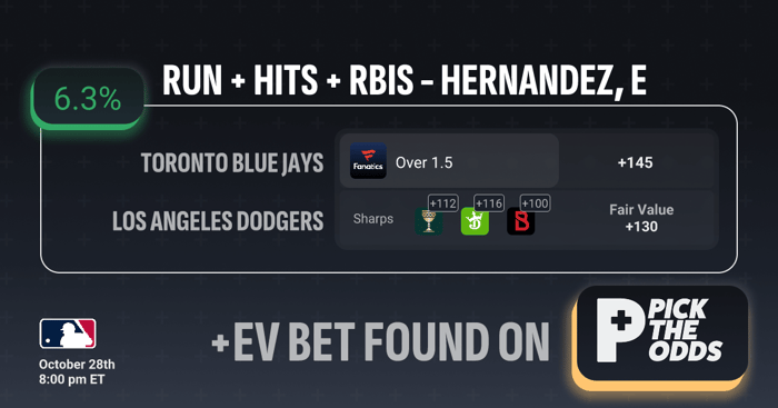 This Enrique Hernández Over 1.5 Runs + Hits + RBIs prop is a clear +EV play because it’s listed at +145, while sharp books like Pinnacle and DraftKings have it priced between +100 and +116, implying a fair value of +130 — giving bettors roughly a 6.3% edge over the market. That means you’re getting significantly better odds than the consensus sharp price. Given Hernández’s recent production — clearing this line last night against Toronto — and his favorable spot against Shane Bieber, who’s shown signs of decline this season, the statistical edge and pricing discrepancy make this a strong value-backed wager.