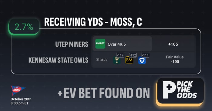 This Christian Moss Over 49.5 Receiving Yards prop is a +EV (+2.7%) play, with Unibet offering +105, while sharp books like Pinnacle, Bookmaker, and FanDuel price the same line between -112 and -117—implying fair odds closer to -100. That discrepancy signals value, as you’re getting plus money on a line the market views as nearly even. Moss has also hit this number in 4 of 5 games, and he faces a UTEP defense ranked near the bottom in passing yards allowed, increasing his probability of clearing this total. When the market consensus sits below even money but a book offers +105, it’s a strong indicator of positive expected value backed by both player trends and sharp market positioning.