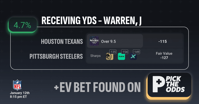 Jaylen Warren Over 9.5 receiving yards grades out as a clear +EV bet based on market disagreement and sharp influence. The best available price of -115 is well above the calculated Fair Value of -127, creating a +4.7% EV edge on this prop. Sharp books are already signaling stronger conviction, with respected markets pricing the Over at -135, -149, and as high as -154, indicating the true probability is meaningfully higher than what the -115 line implies. When multiple sharp books converge well past the offered number, it’s a strong indicator the market is mispriced. With the public-facing book lagging behind sharper consensus pricing, this Over presents a mathematically favorable opportunity backed by both line value and sharp money.