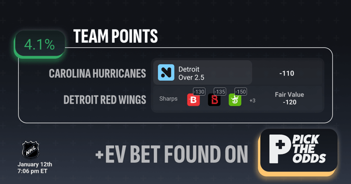 Detroit Over 2.5 Team Points grades out as a clear +EV angle thanks to strong market support and mispriced odds. While one book is hanging -110, the sharpest books on the board are already sitting -130, -135, and even -150, signaling that respected money believes Detroit clears this number at a high clip. With those prices blended, the Fair Value lands around -120, meaning you’re grabbing a 10-cent edge versus the true probability and locking in an estimated +4.1% EV. Anytime a book lags noticeably behind sharper operators, it’s a sign of actionable value—and with Detroit’s offense trending well and the market pushing upward, taking Over 2.5 before the number fully corrects itself is the +EV play.