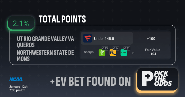 Under 145.5 in UT Rio Grande Valley vs. Northwestern State pops as a +EV opportunity thanks to mispriced market value and sharp-book alignment. While you’re getting +100, the sharper, more efficient books are already shaded to the under at -114, -121, and even -125, signaling that respected money expects this game to finish below the posted total. When those prices are blended, the Fair Value projects around -104, meaning you’re betting into a number that implies a better probability than the sportsbook is accounting for—creating roughly +2.1% EV. Anytime public-facing books offer plus money while sharper operators tax the same side, it’s an indication of true edge, and the under is the side with that value here.