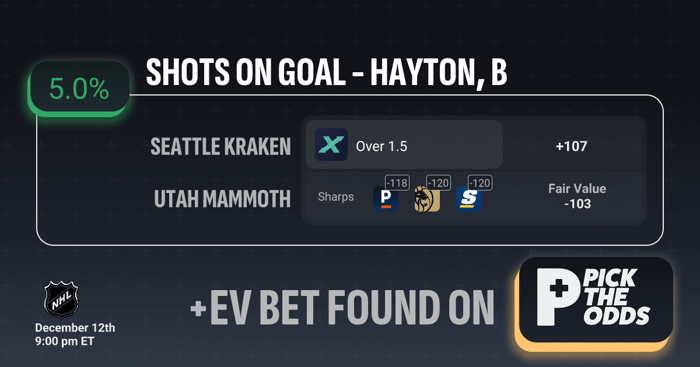 This Barrett Hayton over 1.5 SOG play is +EV because you're grabbing it at +107, while the fair value sits at –103, creating a meaningful pricing gap in your favor. The model gives it a 5.0% EV, driven by sharp books carrying this same prop at –118 to –120, which shows that the true market consensus expects Hayton to go over far more often than the price you're paying. Add in the fact that he has 13 shots over his last 5 games and has cleared 1.5 SOG in 3 of those 5, his recent volume directly supports the over. When the sharpest books are heavily shaded toward the same outcome and you're getting a plus-money number, that’s exactly the type of market discrepancy that produces a strong +EV betting opportunity.