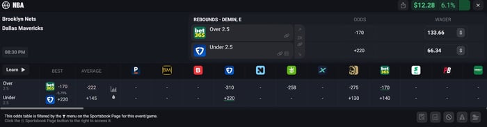 Let's say you take Demin Over 2.5 Rebounds on Bet365 at -170 odds for $133.66. If this side hits you win $212.