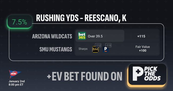 Kedrick Reescano Over 39.5 rushing yards at +115 qualifies as a clear +EV bet based on market disparity and sharp consensus. While bet365 is offering +115, the fair value on this line is +100, creating a 7.5% edge compared to true odds. Sharp sportsbooks are already signaling value on the over, with Bookmaker pricing it at -112 and Pinnacle at -115, showing respected money is laying juice on the same side. When sharp books are shaded heavily toward the over while a soft book is still offering plus money, it creates an exploitable inefficiency. The combination of sharp alignment, a favorable price gap, and a +7.5% EV makes Reescano Over 39.5 rushing yards a mathematically sound long-term profitable play.