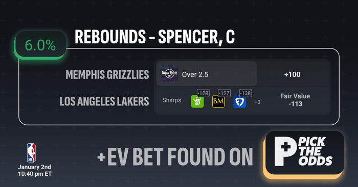 Cam Spencer Over 2.5 rebounds at +100 stands out as a strong +EV bet due to clear market disagreement and sharp alignment. While Hard Rock is offering even money, multiple sharp sportsbooks are heavily juiced on the over, with DraftKings at -128, Bookmaker at -127, and FanDuel at -138, signaling respected money expects this line to cash more often than not. The fair value is priced at -113, meaning +100 represents a meaningful edge over the true odds and results in a 6.0% expected value. When sharp books are forcing bettors to lay significant juice on the over while a softer book lags behind at even money, it creates an exploitable inefficiency — making Spencer Over 2.5 rebounds a mathematically sound +EV play.