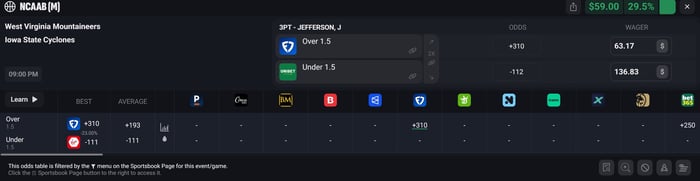 Let's say you take Jefferson Under 1.5 3's on FanDuel at -112 odds for $136.83. If this side hits you win $259.
