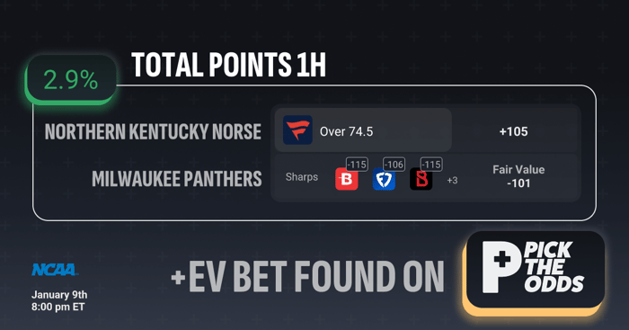 This 1H Over 74.5 total points is a +EV bet because +105 is available while the sharp books are aligned well below that at -115, -106, and -115, signaling the true probability is meaningfully higher than the offered price. When multiple respected books converge on a much shorter number, it’s a strong indication the over is correctly favored by the market. Based on those sharper odds, the fair value is -101, so getting +105 creates a clear pricing edge. That difference results in an estimated +2.9% expected value, making this a solid long-term profitable position.