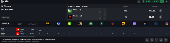 Let's say you take Demin Over 15.5 PRA on Bet365 at -110 odds for $117.16. If this side hits you win $223.
