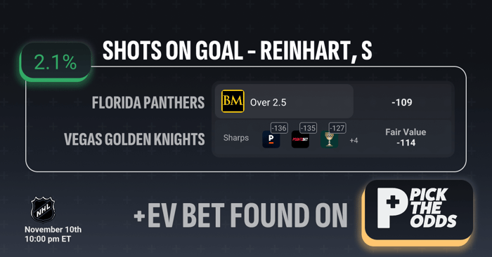 Sam Reinhart over 2.5 shots on goal at -109 (BetMGM) presents a small but meaningful +EV edge of 2.1%, driven by sharp market discrepancies. Across top books, Pinnacle (-136), PointsBet (-135), and Caesars (-127) all price this same prop shorter, implying a fair value of -114. That means BetMGM’s current line is mispriced relative to the most efficient markets — a clear indicator of positive expected value. The +EV rating reflects that the market expects Reinhart to go over this number more often than the odds suggest, especially given his 9 games with 3+ shots this season and heavy usage on Florida’s top line and power play. With sharp consensus leaning toward the over and a fair value edge of 5 cents, this prop stands out as a smart, data-backed wager before the line tightens.