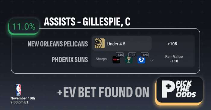 Collin Gillespie under 4.5 assists at +105 (MGM) stands out as a strong +EV play (+11.0%) with clear market inefficiency across sharp books. Top sportsbooks like PointsBet (-145), Caesars (-136), and FanDuel (-128) all have this prop priced significantly shorter, implying a fair value of -118. That means the +105 line offers over a 25-cent discrepancy compared to the sharp consensus — a strong indicator of mispricing. Gillespie has also gone under this number in five games already this season, supporting the data-based case for the under. With the sharp side heavily tilted toward the under and market prices suggesting the true odds are far worse than +105, this bet provides a clear edge in expected value that should be capitalized on before the line moves.