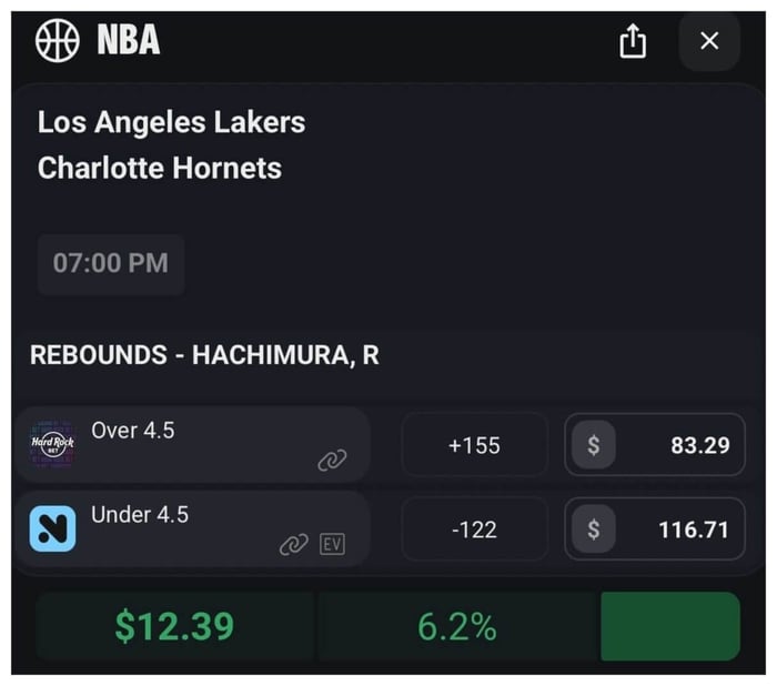 Let's say you take Hachimura Over 4.5 rebounds on Hard Rock at +155 odds for $83.29 If this side hits you win $212.