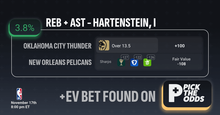 This is +EV because the market and sharps disagree with the public price: sharps have been laying juice on the same side (books showing roughly -127, -122 and -126), while our aggregated fair value sits near -108 — yet the publicly available line is +100, leaving about a 3.8% edge. On the court Hartenstein is Oklahoma City’s primary big for rebounds and short-roll facilitation, and he’s hit this 13.5 line comfortably in 3 of his last 5 games; the two misses came in clear blowouts where his minutes were limited (≈20 minutes), not because of a sustained decline in production. Matchup-wise New Orleans tends to allow offensive rebound/paint time that fuels Hartenstein’s board rate and gives him easy assist opportunities on close-range kick-outs, so the combination of role + matchup plus sharp money tilting the true probability higher makes buying +100 here a systematic value bet, not a gut play.