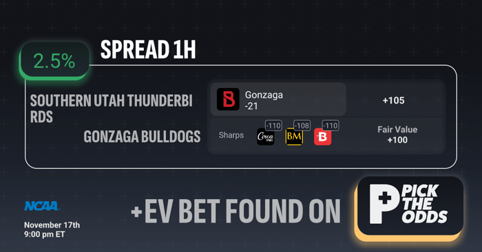 Gonzaga -21 in the first half at +105 qualifies as a +EV play because sharp books — including Circa, Bookmaker, and BetOnline — are all pricing the same number between -108 and -110, implying a more accurate fair line of +100. That means the market’s most respected oddsmakers see Gonzaga as more likely to cover this aggressive first-half spread than the plus-money price suggests. Southern Utah’s significant talent gap and pace vulnerability amplify Gonzaga’s ability to create early separation, especially at home where the Bulldogs historically start fast and overwhelm mid-major opponents with efficiency and depth. The combination of strong matchup dynamics and clear off-market value is what produces the positive expected value edge.