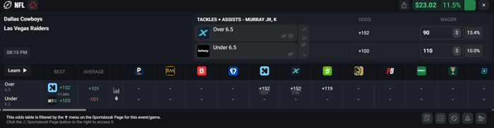 Let's say you take Murray Jr Over 6.5 Tackles + Assists on ProphetX at +152 odds for $90. If this side hits you win $223.