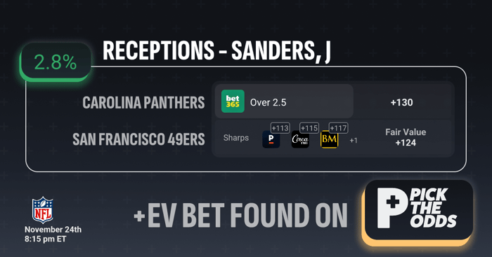 Ja’Tavion Sanders Over 2.5 receptions at +130 presents clear value when compared to the market and sharp consensus, making it a legitimate +EV play at 2.8%. Sharps are already pricing this prop tighter in the +113 to +117 range, signaling that respected money views this line as mispriced. With the calculated fair value at +124, getting +130 creates an edge over the true implied probability, giving bettors extra cushion beyond what the market suggests. This discrepancy between sportsbook odds and sharp pricing indicates the line is shaded too heavily toward the under, and when you combine that with Sanders’ proven ability to clear this number and a favorable matchup for TE receptions, the pricing inefficiency is exactly what defines a profitable +EV opportunity.