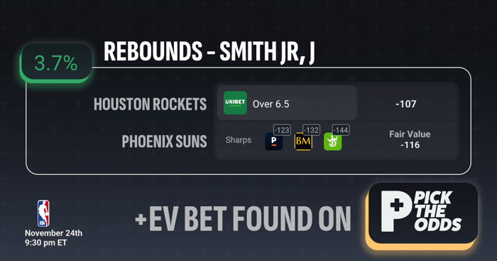 Jabari Smith Jr. Over 6.5 rebounds at -107 qualifies as a strong +EV play at 3.7% because the available price is noticeably softer than where sharp money and true odds suggest it should be. Sharps are already backing this over in the -123 to -144 range, indicating respected bettors are comfortable laying a steeper price than what’s currently being offered. With the calculated fair value sitting at -116, getting in at -107 provides an edge over the actual implied probability of the outcome. When sportsbook pricing lags behind sharp consensus and fair value by nearly 10 cents, it creates exactly the type of inefficiency bettors look for — making this a clear, analytically supported +EV opportunity.