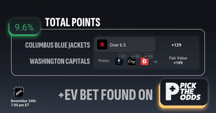 The Blue Jackets vs Capitals Over 6.5 at +129 is a clear +EV play at 9.6% because the current price is well above where the market and sharp money believe it should be. Sharps are already comfortably backing this total in the -101 to +103 range, signaling that respected bettors see the true probability as significantly higher than what +129 implies. With the calculated fair value sitting at +109, you’re gaining a substantial edge by locking in +129, creating a meaningful gap between sportsbook pricing and true odds. When sharp consensus and fair value both sit well below the available number, it highlights a mispriced line — and that discrepancy is exactly what defines a strong +EV betting opportunity.