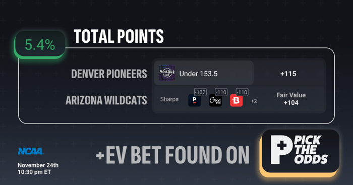 The Under 153.5 at +115 on Denver vs Arizona stands out as a strong +EV play at 5.4% because the current price is notably higher than what sharp money and true probability indicate. Sharps are already shaping this total in the -102 to -110 range, signaling that respected bettors believe the under should be favored, not offered at plus money. With the calculated fair value at +104, locking in +115 gives bettors extra edge over the true implied odds, creating a clear gap between market pricing and reality. When sharp consensus and fair value both point to a much shorter number, that discrepancy highlights a mispriced line — and that inefficiency is exactly what creates a profitable +EV betting opportunity.