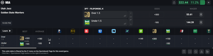 Let's say you take Filipowski Over 1.5 3's on BetMGM at +300 odds for $55.61. If this side hits you win $222.