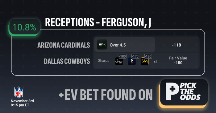 Jake Ferguson’s Over 4.5 Receptions prop stands out as a clear +EV play with a 10.8% expected value according to market analysis. While the line is available at -118, sharper books such as Circa, Pinnacle, and BookMaker have this number priced much higher in the -170 to -180 range, indicating strong professional backing on the over. The fair value sits around -150, creating significant closing line value for bettors locking in early. Ferguson’s high target share and consistent volume make this prop statistically sound, but the real edge lies in the price disparity—backing the over here captures true market inefficiency, giving bettors a strong +EV position.
