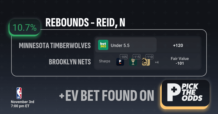 Naz Reid’s Under 5.5 Rebounds prop grades out as a strong +EV play at +120, carrying an expected value of 10.7% according to market projections. Sharper books like Pinnacle, Circa, and BetMGM have this line priced in the -105 to -115 range, signaling that the true fair value sits around -101 — a major pricing edge versus the public market. This discrepancy shows that sharp bettors and algorithms expect regression on Reid’s rebounding numbers, especially against a Nets squad that ranks among the better rebounding teams in the league. With the books implying shorter odds on the under, taking it at +120 offers excellent closing line value and a clear mathematical advantage.