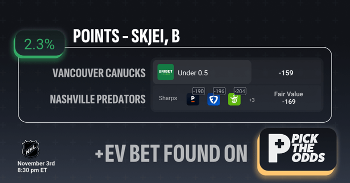 Brady Skjei’s Under 0.5 Points prop is showing solid +EV value at 2.3%, priced at -159 on Unibet while sharp books like Pinnacle, FanDuel, and DraftKings have this line much shorter between -190 and -204. The fair value for this play sits around -169, meaning bettors are getting a better price than the true market consensus. This indicates that sharp money and advanced models expect Skjei to remain off the scoresheet more often than the odds imply. With limited offensive production this season and a tough defensive matchup, this slight but consistent edge makes it a profitable long-term +EV wager.