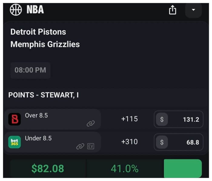 Let's say you take Stewart Under 8.5 Points on Bet365 at +310 odds for $68.80 If this side hits you win $282.