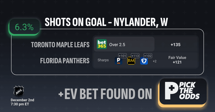 This is a +EV bet because Bet365 is offering Over 2.5 shots for Nylander at +135, which is significantly better than both the sharp books’ prices (+101, +113, +102) and the calculated fair value of +121. Since the available line (+135) is longer than what sharp markets deem accurate (+121), the bettor is getting extra implied probability value, resulting in a calculated expected value of +6.3%. In short, you're betting at a price that is meaningfully above the true market-efficient line, creating a positive long-term edge.