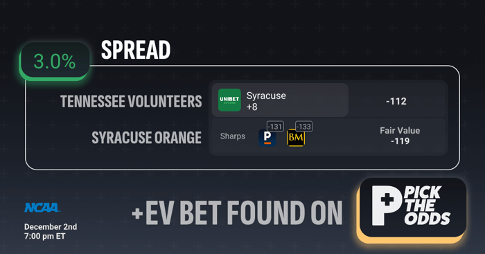 This is a +EV bet because Syracuse +8 at -112 is priced well better than the confirmed fair value of -119, creating roughly a 3.0% edge. Two sharp sportsbooks are also showing this line much higher, sitting around -131 and -133, which signals strong market support on the Syracuse side and suggests the true probability is greater than what -112 implies. When the sharps are heavily aligned and the fair price projects shorter than what’s available, you’re capturing clear closing-line value — exactly what makes this a positive-EV wager.