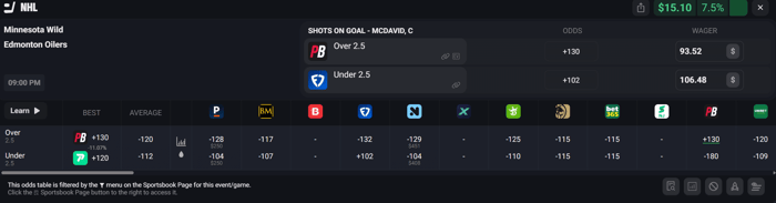 Let's say you take McDavid over 2.5 Shots On Goal on PointsBet at +130 odds for $93.52. If this side hits you win $215.