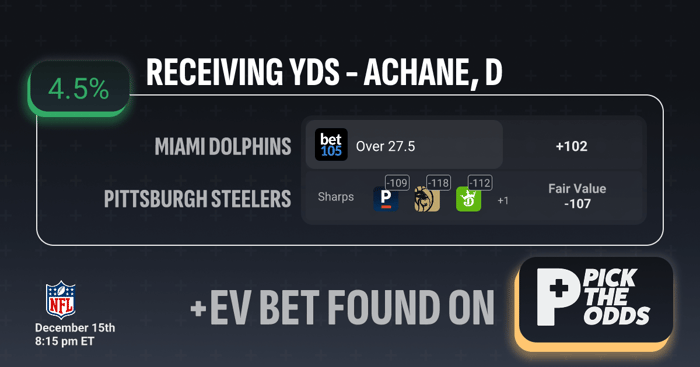De’Von Achane over 27.5 receiving yards is a clear +EV bet at +102 given the surrounding market and sharp consensus. Multiple sharp books are pricing this prop significantly shorter, with respected markets showing -109, -112, and as high as -118, indicating strong agreement that the true probability is higher than what +102 implies. Pick The Odds’ fair value of -107 suggests this line should be closer to a modest favorite, creating a 4.5% edge at the current price. When you’re getting plus money on a prop that sharp books have already shaded toward the over, you’re capturing closing line value and betting into a mispriced market — exactly what you want in a long-term profitable +EV approach.