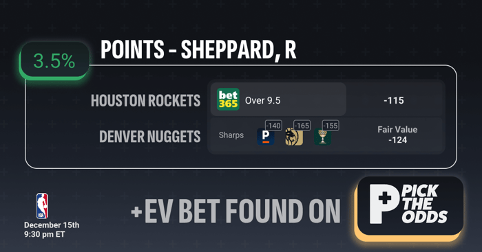 Reed Sheppard over 9.5 points is a clear +EV play at -115 when you compare it to the rest of the market and sharp pricing. Several sharp books are already shading this over much heavier, with prices sitting around -140, -155, and as high as -165, signaling strong market confidence that this line should be juiced. Pick The Odds’ fair value of -124 confirms the mispricing, making -115 a favorable entry point and creating a 3.5% expected value edge. When you’re able to grab a key number at a cheaper price than where sharp books are dealing it, you’re locking in positive closing line value and betting into a spot where the true probability is higher than the implied odds.