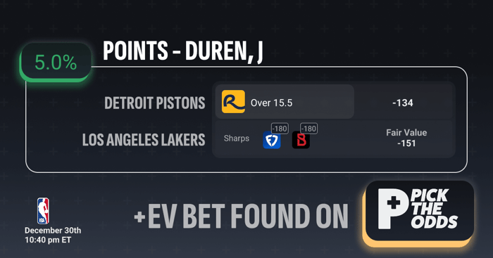 Jalen Duren Over 15.5 Points (-134) profiles as a clear +EV bet because the market is mispriced relative to sharp consensus. Multiple sharp books have this prop priced as high as -180, signaling strong professional action on the over, while the Fair Value is -151, creating a meaningful gap from the available number. That discrepancy results in an estimated +5.0% EV, which is a significant edge for a player prop. When sharper sportsbooks are aligned well above the market price and recreational books lag behind, it’s a strong indicator the line hasn’t fully adjusted—making this over a mathematically profitable position long term.