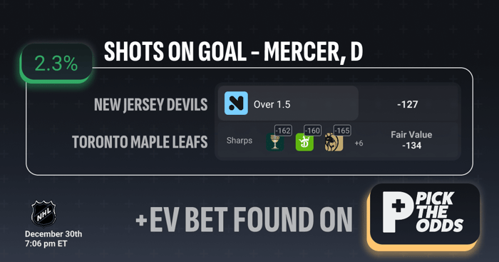 Dawson Mercer Over 1.5 Shots on Goal (-127) qualifies as a +EV bet due to a clear pricing gap between the available line and sharp market consensus. Several sharp sportsbooks are dealing this prop significantly higher at -160, -162, and -165, indicating strong professional support on the over, while the listed Fair Value sits at -134. With the market still offering -127, bettors are getting a number below where both sharps and fair pricing suggest it should be. That difference translates to an estimated +2.3% EV, making this a mathematically profitable edge when targeting long-term expected value.