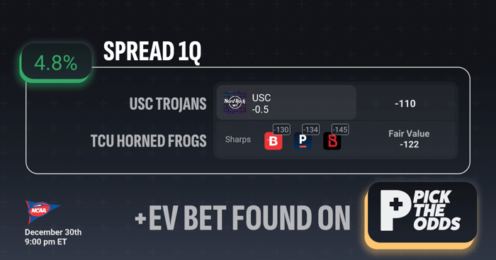 USC -0.5 1st Quarter (-110) stands out as a +EV bet because the current market price lags behind sharp consensus. Multiple respected sharp sportsbooks are dealing this same 1Q spread at -130, -134, and as high as -145, signaling strong professional money backing USC early, while the Fair Value is priced at -122. With bettors still able to grab -110, that gap creates a clear inefficiency in the market. The difference between the available line and where sharps have already moved it results in an estimated +4.8% EV, making this a strong value position that benefits from both sharp alignment and favorable pricing relative to true odds.