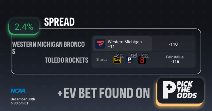 Western Michigan +11 at -110 grades out as a clear +EV play because sharp money is consistently pricing this spread shorter than what’s being offered. Major sharp books are dealing this line in the -124 to -136 range, implying the true probability is much higher than the -110 price suggests. Based on that market consensus, the fair value comes out to around -116, meaning you’re getting several cents of edge by locking it in at -110. With an implied edge of roughly 2.4% EV, this is a classic case of beating the closing line by following where the sharps are already positioned and taking the best number available.
