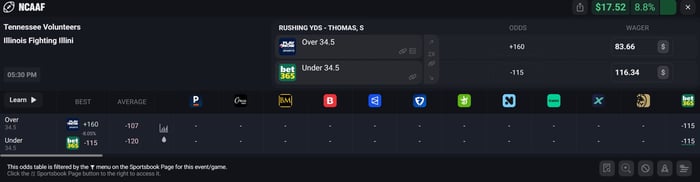 Let's say you take Thomas Under 34.5 Rushing Yards on Bet365 at -115 odds for $116.34. If this side hits you win $217.