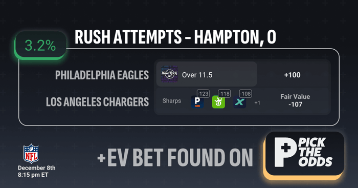 This is a +EV bet purely from a market and pricing standpoint: the sharp books are all sitting between -108 and -123 on Hampton’s Over 11.5 rush attempts, creating a consensus fair value of about -107. When the true market price is projected at -107 but a sportsbook is offering +100, you’re getting a clear pricing inefficiency — meaning you’re paying less than what the sharp side believes the bet is actually worth. That discrepancy produces the 3.2% Expected Value shown in the model, driven entirely by the gap between sharp odds and the available number. No narratives, no matchup assumptions — just a straight mathematical edge created by the market.